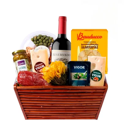 Cesta com queijos, frios, petiscos e vinho para você desfrutar de um momento aconchegante ao lado de pessoas queridas.